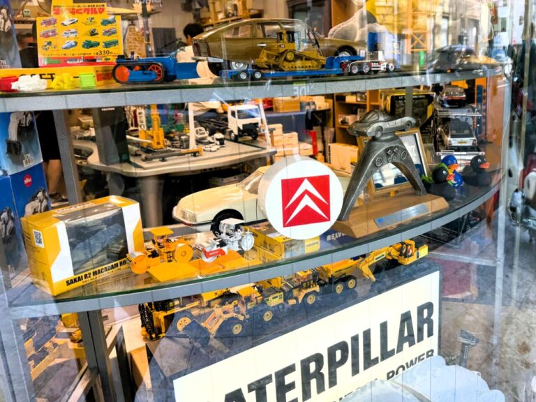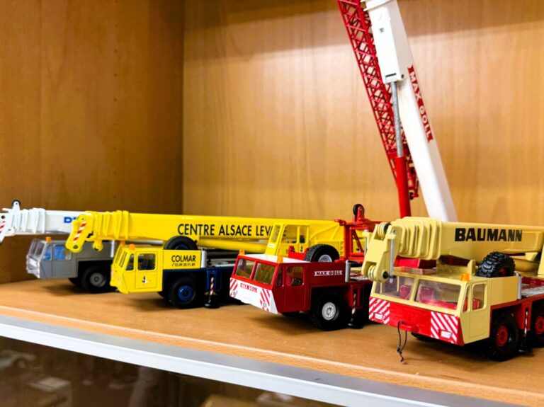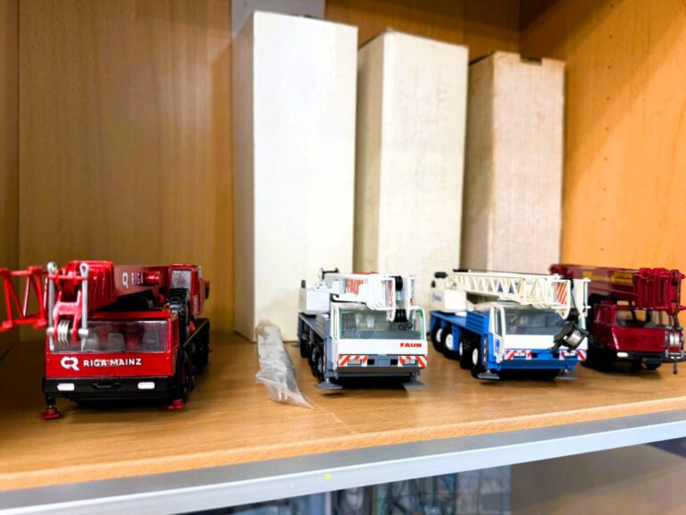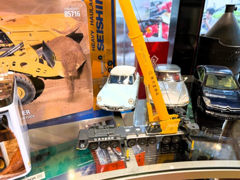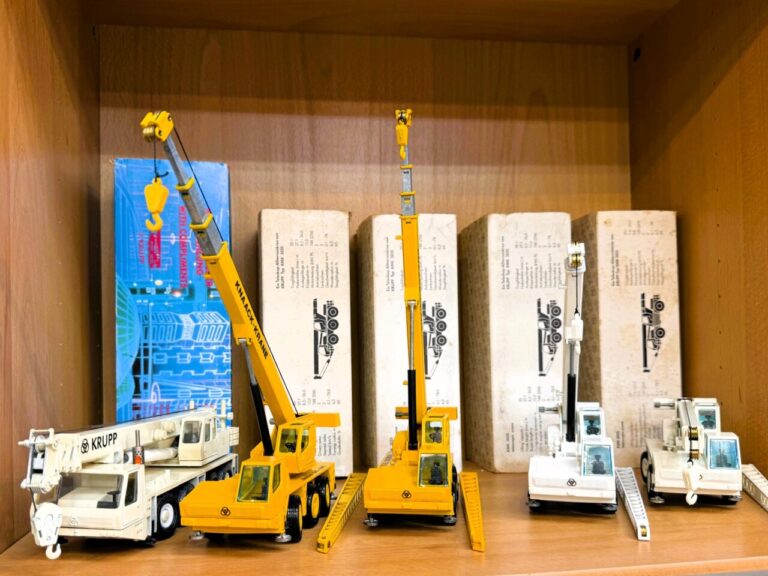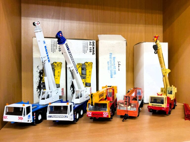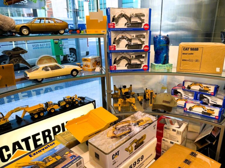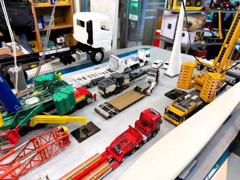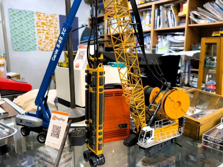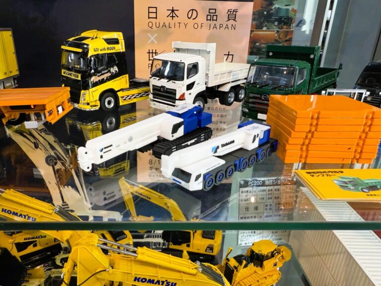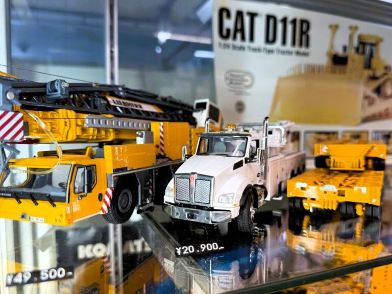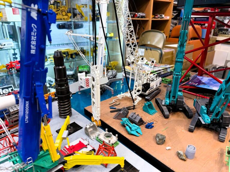 ショールームの扉を開けると、そこは重機模型の世界!!高さ2mもある大型クレーン車たちが貴方をお迎えいたします。