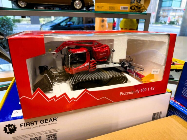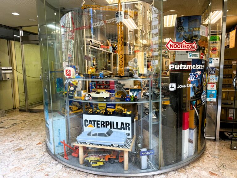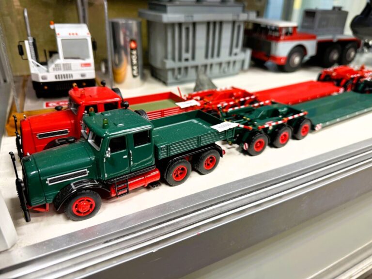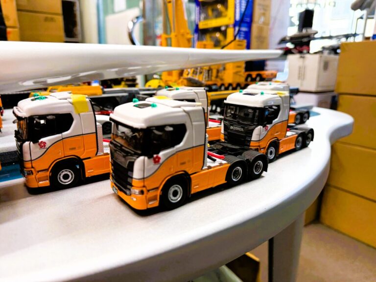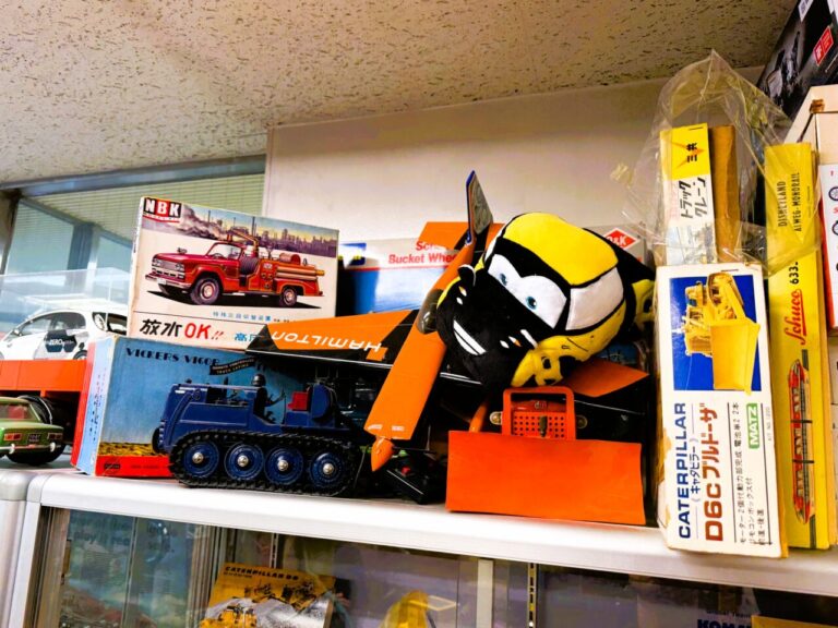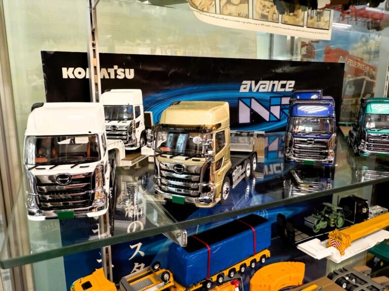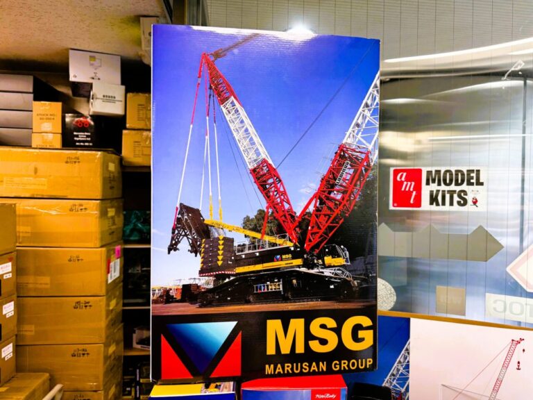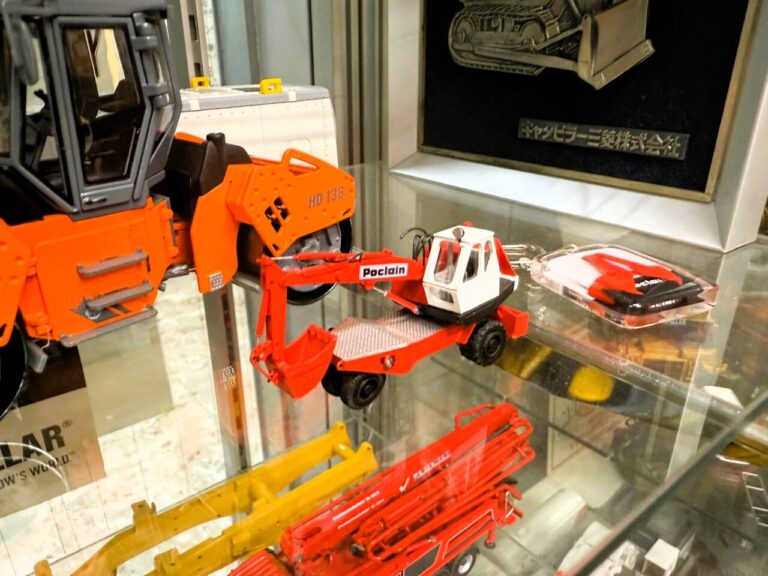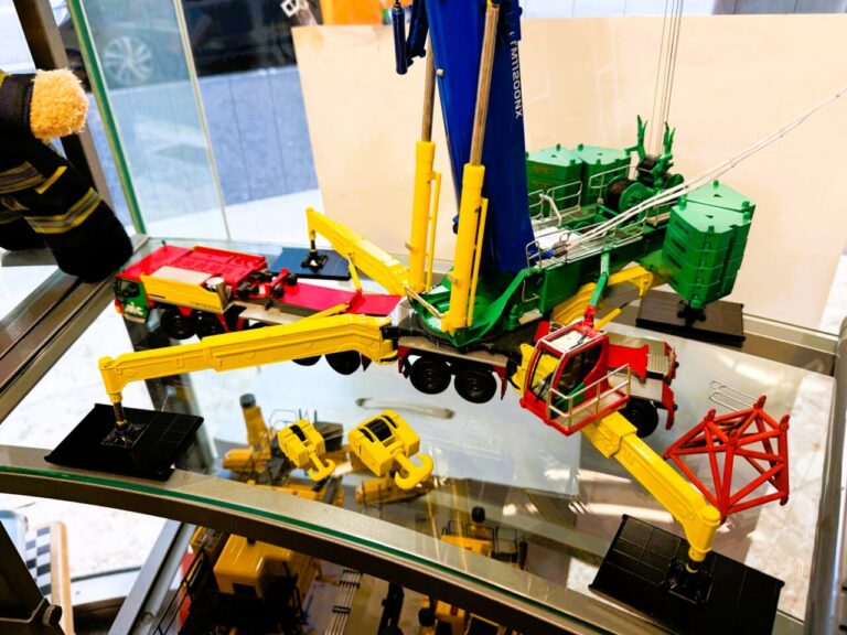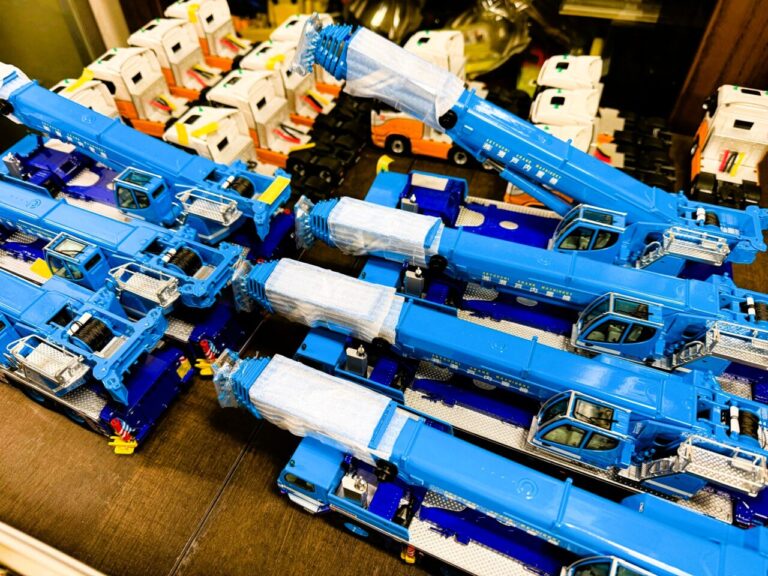 ショールームの扉を開けると、そこは重機模型の世界!高さ2mもある大型クレーン車たちが貴方をお迎えいたします。