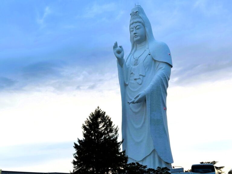 この観音像のメンテンナンス作業にはクレーンにスカイボックスを取り付けての清掃が過去に実施されました。