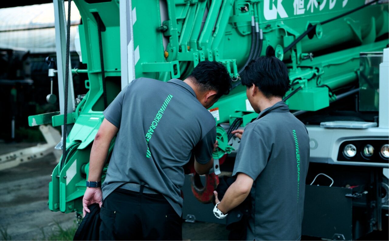 私たち植木クレーンは一緒に働く仲間を募集しています。未経験でも大丈夫。スキルより人間性に重きを置いているため、操作、運転など熟練した先輩が親身になって指導いたします。