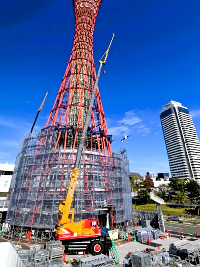 開業から60年が経ち、2021年より耐震・改修工事のために白い幕がかけられていましたが、2023年12月ついに点灯式でその新しい姿を披露し、再び神戸の街を照らし始めました。株式会社昭和組はこの工事にクレーンで参画しています。
