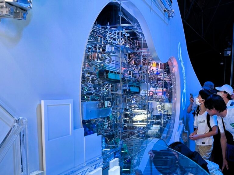 「リアルゾーン」には実物のボールが転がるボールコースターでものづくり・まちづくりの繋がりを表現しています。次々としかけを通るボールをずっと子供たちが楽しそうに追っています。神戸ポートタワーも見えますね。