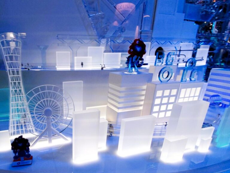 「象徴ゾーン」には未来の都市を映しだす直径2mの球体モニターがお出迎えしてくれます。映像は「現在の街」から「未来の街」へと移り変わっていきます。次々としかけを通るボールをずっと目で追いかけていきます。