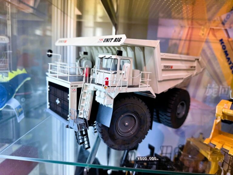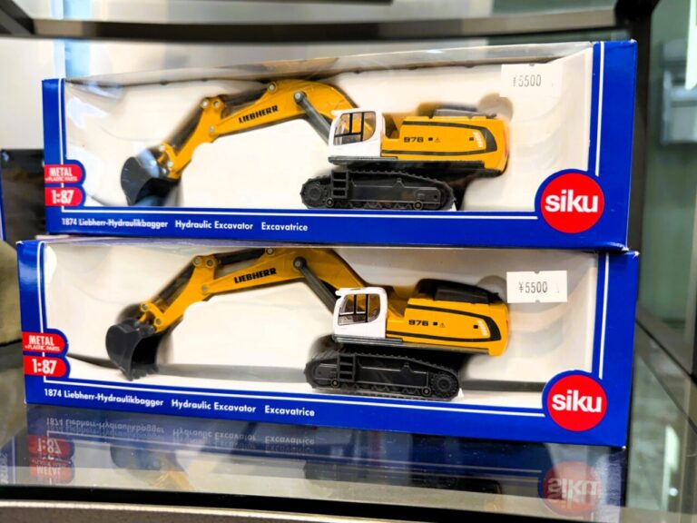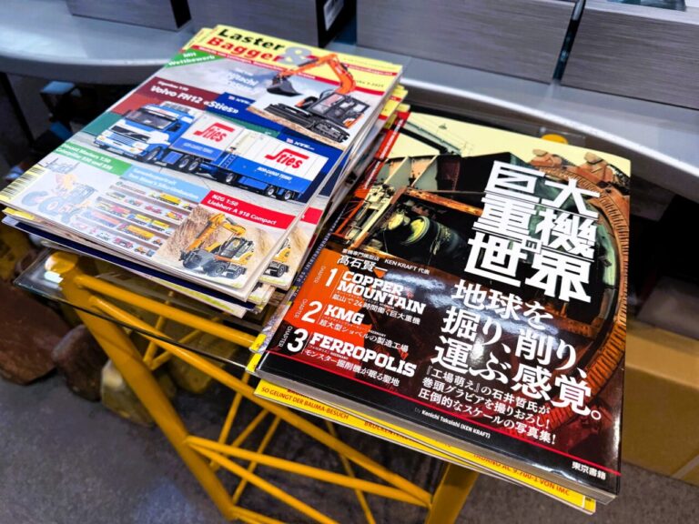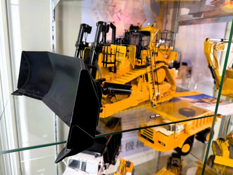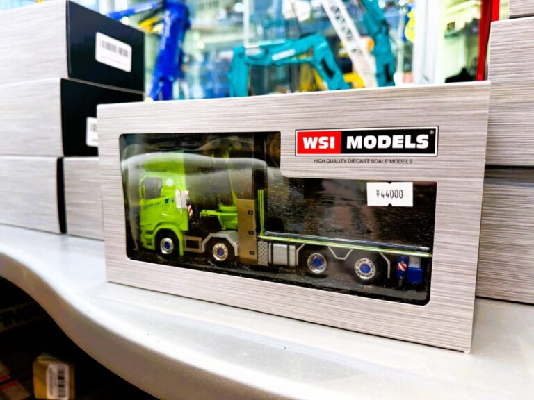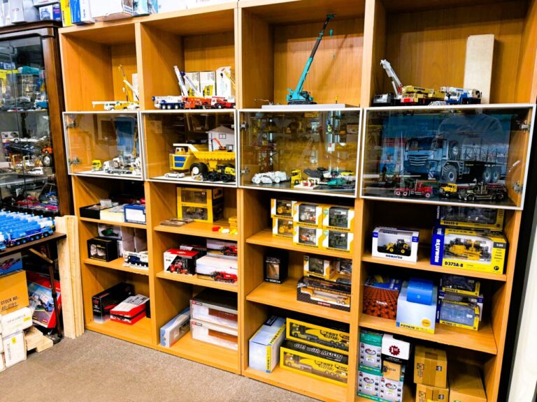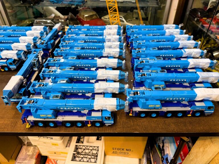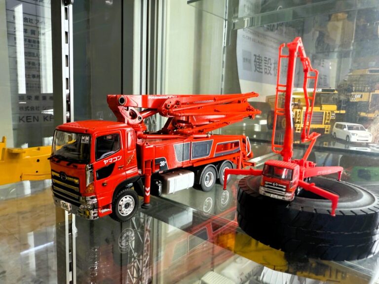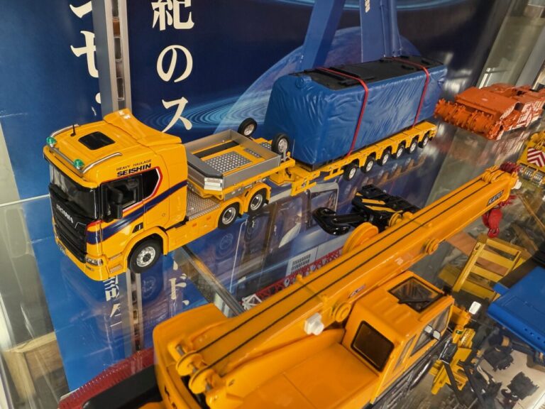 ショールームの扉を開けると、そこは重機模型の世界!高さ2mもある大型クレーン車たちが貴方をお迎えいたします。