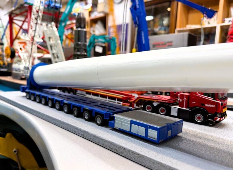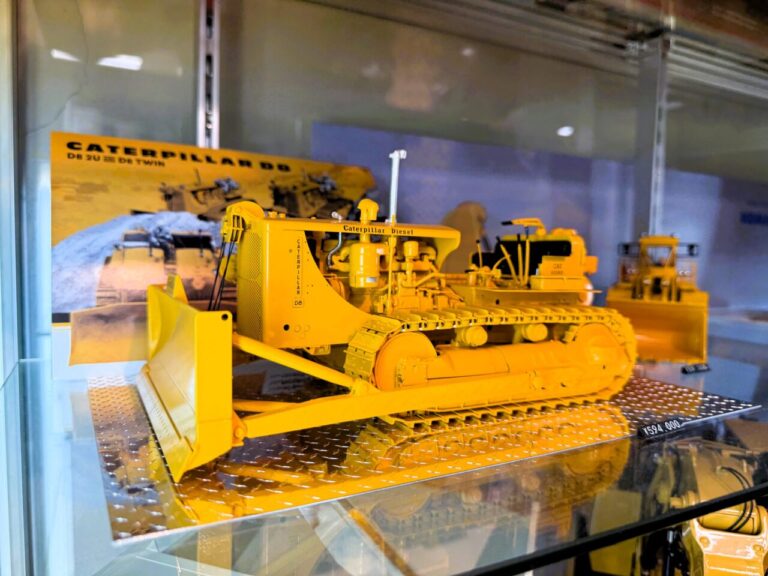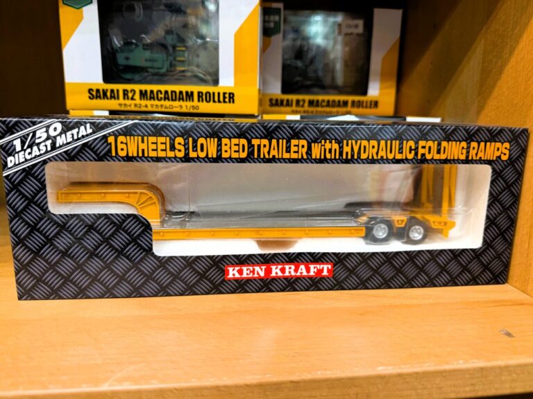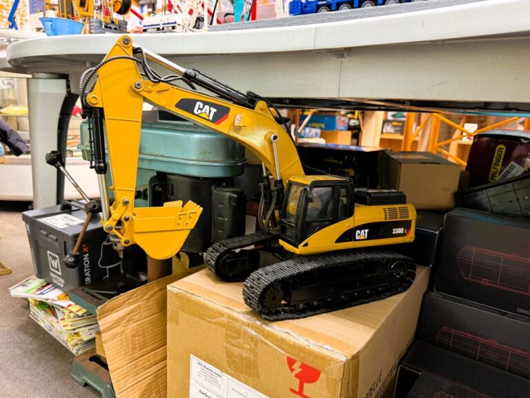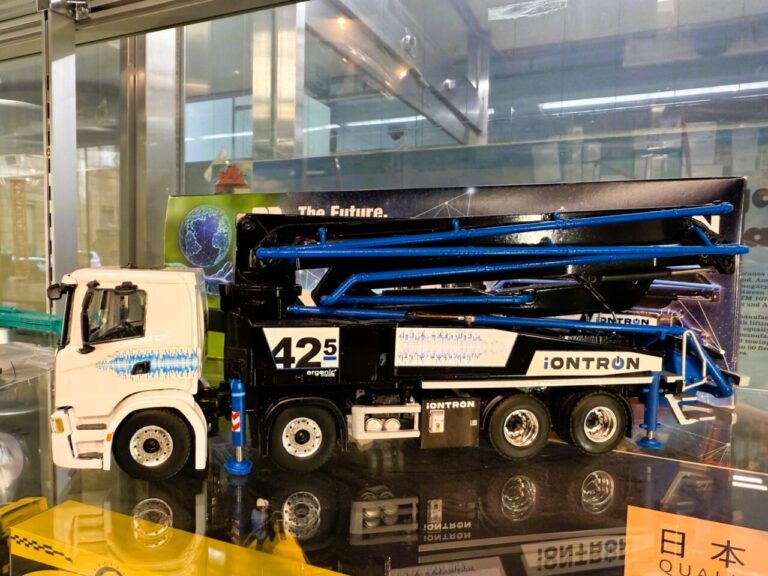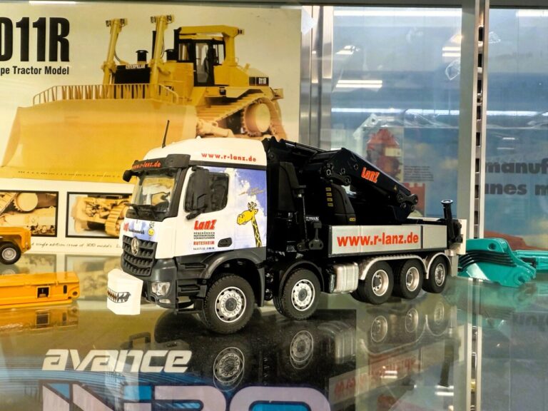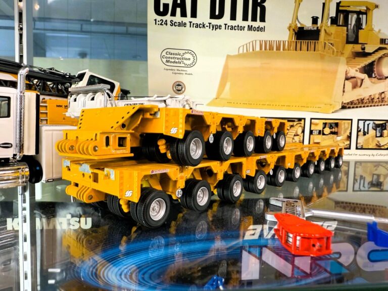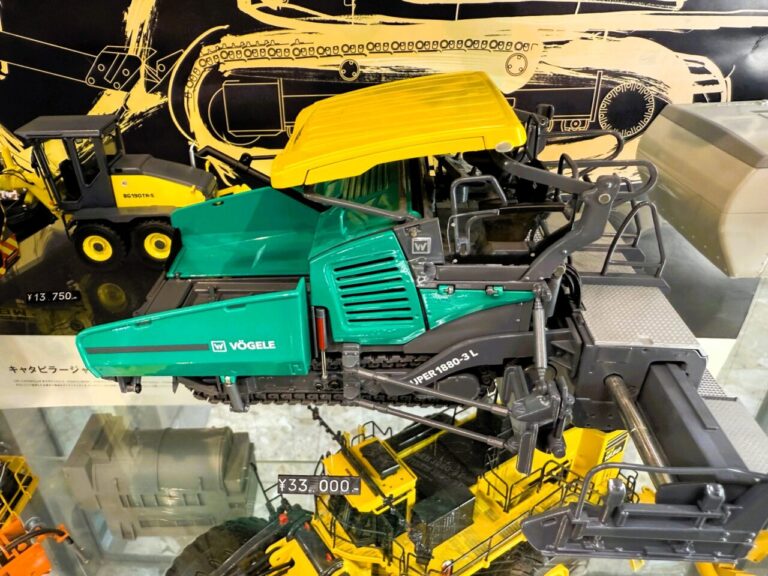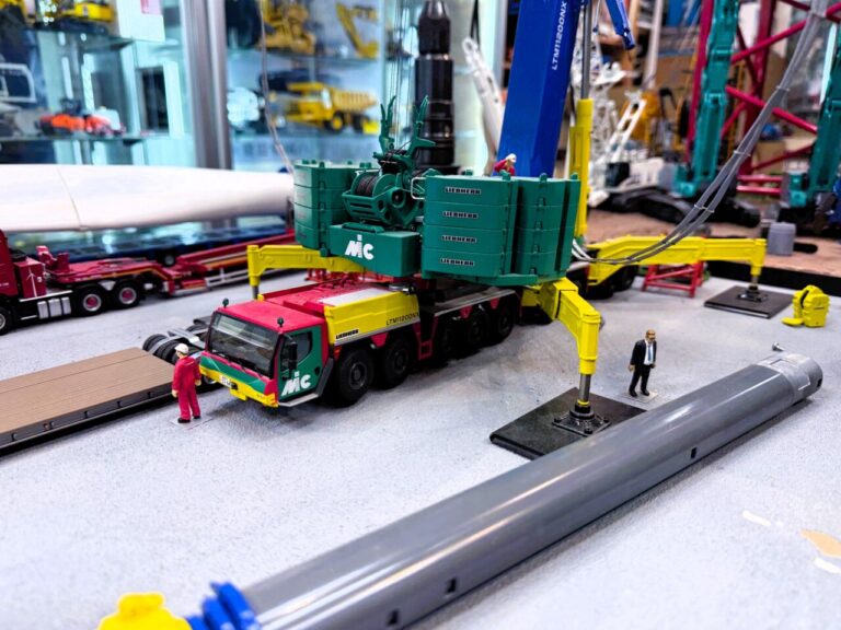 ショールームの扉を開けると、そこは重機模型の世界!高さ2mもある大型クレーン車たちが貴方をお迎えいたします。