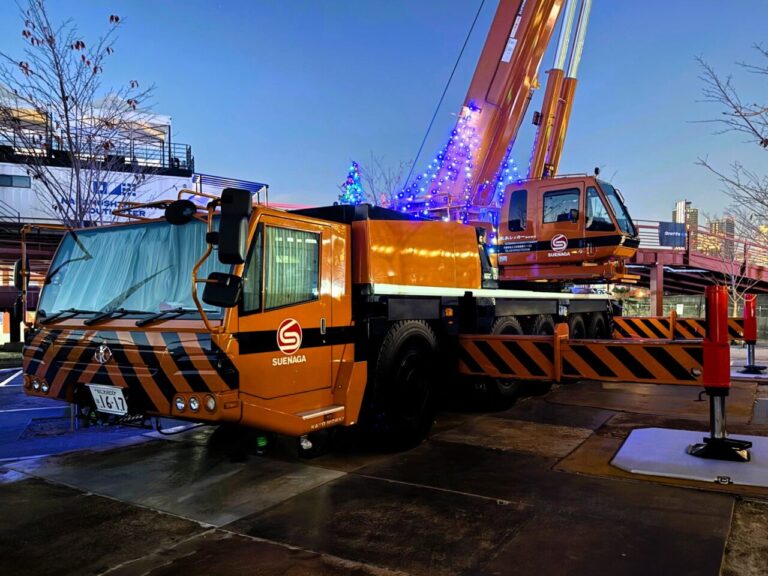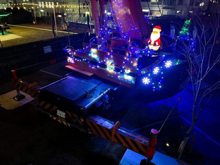 クリスマスシーズンということもあり、クレーンにはサンタクロースや煌びやかな青いイルミネーションが施され、オールテレーンがまるでお伽話の魔法の杖のように見えます。