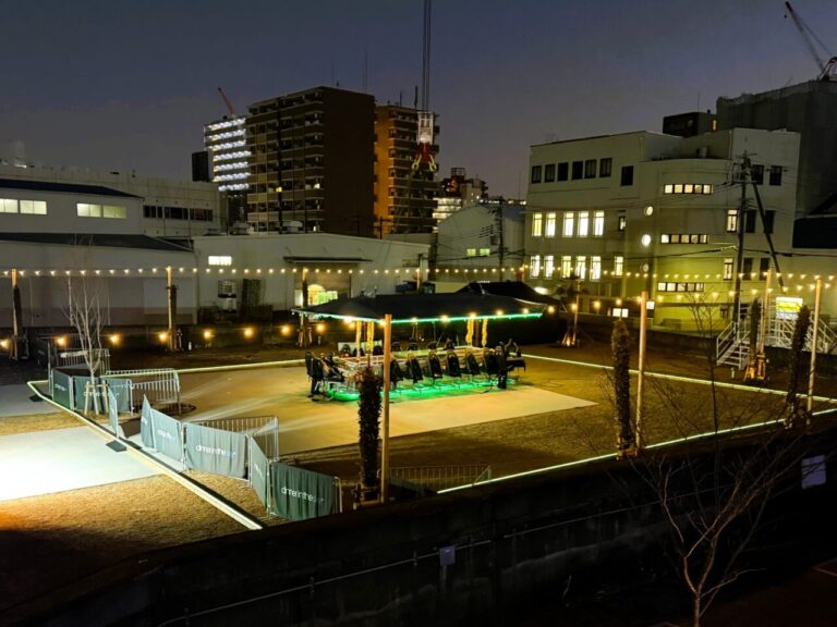 遠くには大阪のビル群の明かりが瞬き、川面に反射するネオンが幻想的な夜を演出します。周囲のビル群の明かりと、会場のイルミネーションが重なり、まるでSF映画のような近未来的なディナー風景です。