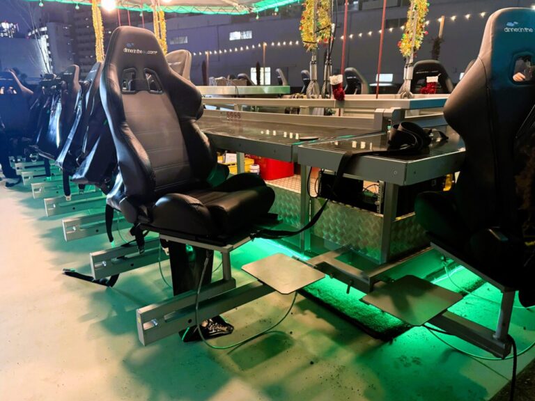 シートはレーシングカーのような4点式シートベルトで体を固定します。安心感はありますが、足元が完全に「空」なので、やはり浮遊感は凄まじいです。