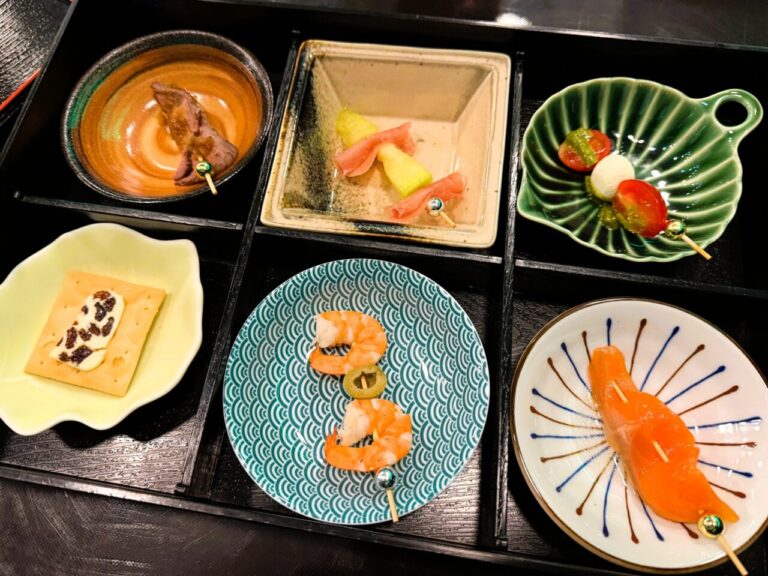 海老のグリル、スモークサーモン、カプレーゼ仕立てのピンチョス、生ハムメロンなど、目にも楽しい一皿が並びます。