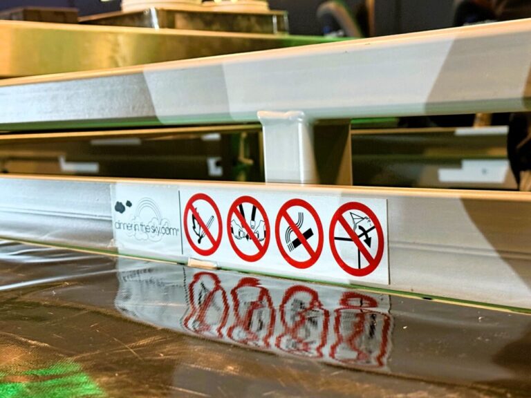 テーブルには「禁煙」や「落下防止」などの禁止事項を示すアイコンが貼られており、安全への意識の高さが伺えます。