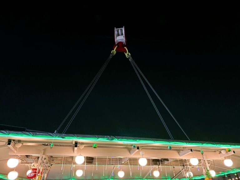 なお、空中に運ばれたテーブルの総重量は約7tでした。130tオールテレーンがフルウェイトを背負っていたのでオペレーターさんに確認してみると、念の為に安全率を掛けてウェイトを全て背負っているそうです。